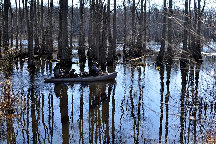 In the afternoon, the hunting party headed back out to the swamp, where our guide, Marine veteran Bob, navigated the canoe to ideal positions. Small flocks of ducks and geese flew over, much to the delight of our service members.