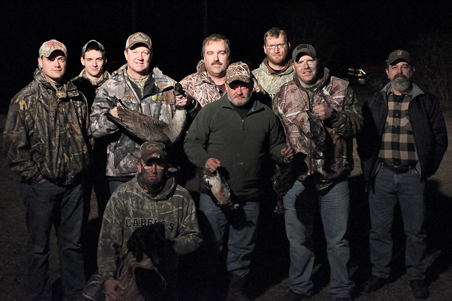 This was the company that rose before dawn on Saturday morning to arrive at two separate hunting sites—a duck impoundment on a farm and a spacious swamp location—by 5:30. After hunting under the light of a full moon and into the early sunrise, the gang took a break back at the clubhouse.